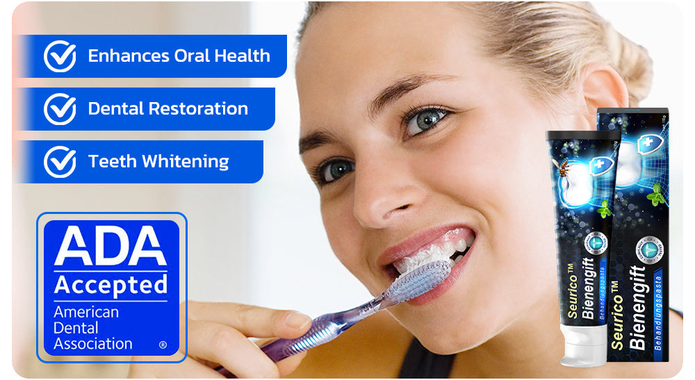 Seurico™ Bienengift Behandlung Zahnpasta enthält Bienengift, das für seine antibakteriellen, entzündungshemmenden, antioxidativen und geweberegenerierenden Eigenschaften bekannt ist. Das als „flüssiges Gold“ bekannte Bienengift fördert effektiv die Zahnregeneration und wurde von der ADA klinisch getestet, um die allgemeine Mundgesundheit zu verbessern.