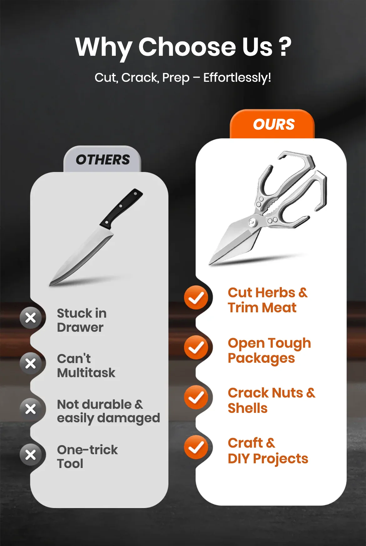 Dull scissors that struggle to cut through chicken bones, fish fins, or tough vegetables?